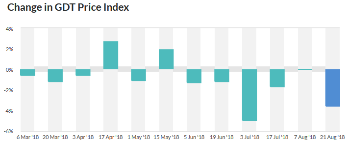The latest GDT results showed a decline of 3.6% in the past fortnight - the second largest drop since March - which means this metric has fallen by more than 10% since May. Source: Globaldairytrade.info