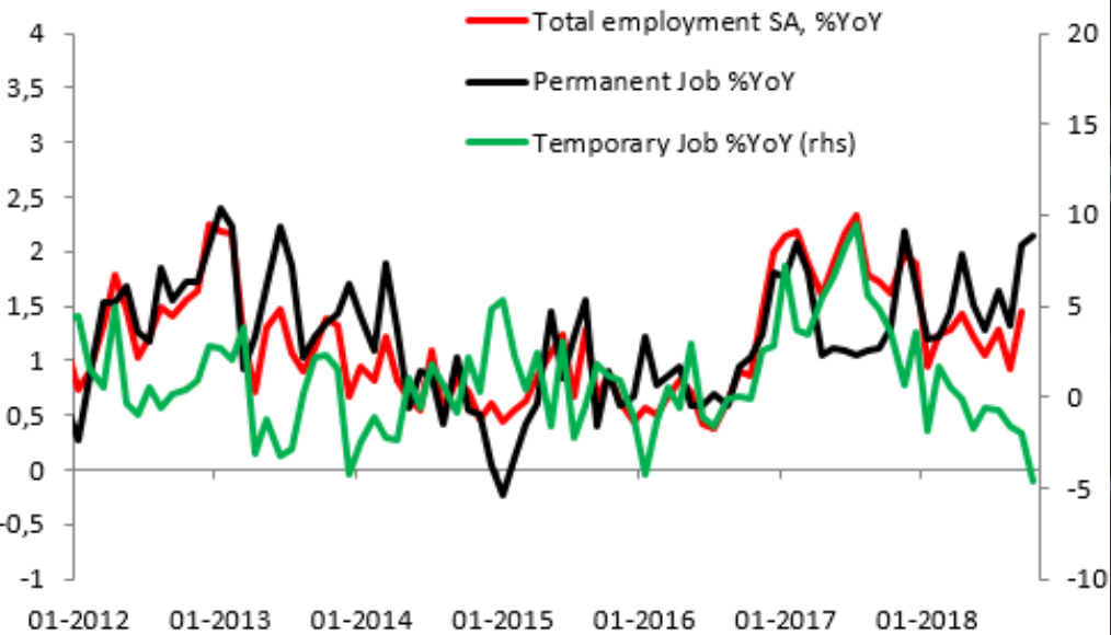 Total employment rose by a little less than expected in the latest release but the composition of the roles improved with permanent jobs rising and temporary ones falling. Source: XTB Macrobond