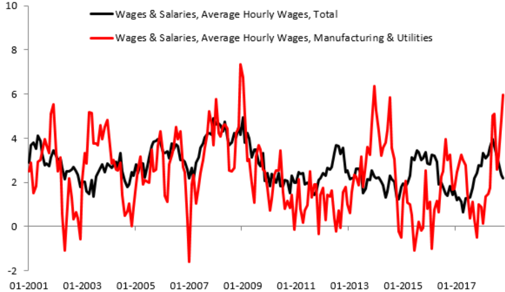 Despite a pick up in the manufacturing and utilities sectors, wages dropped on the whole last month which came as a negative shock as they were predicted to rise. Source: XTB Macrobond