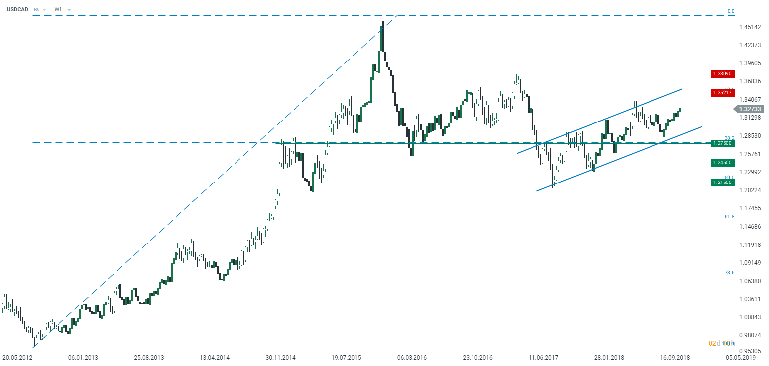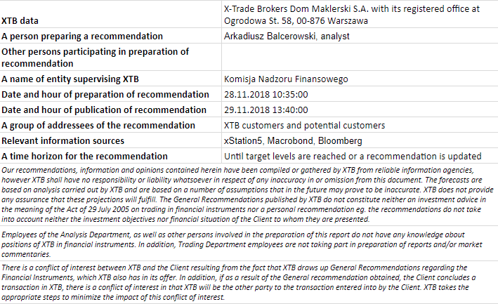 Technically the pair has been trading within the ascending channel since July 2017. The latest swing to the upside coincided with the slide in oil prices and has seen the pair bouncing off the lower bound of the mentioned linear pattern. While the pair keeps rising, it may soon run into an obstacle - the upper boundary of the channel (ca. 1.3520). This level could again serve as a turning point, pushing the price back toward the middle of range trading. Having this in mind we recommend going short at a limit price of 1.35, a target of 1.2750 followed by 1.22 and a stop order at 1.38. Source: xStation5