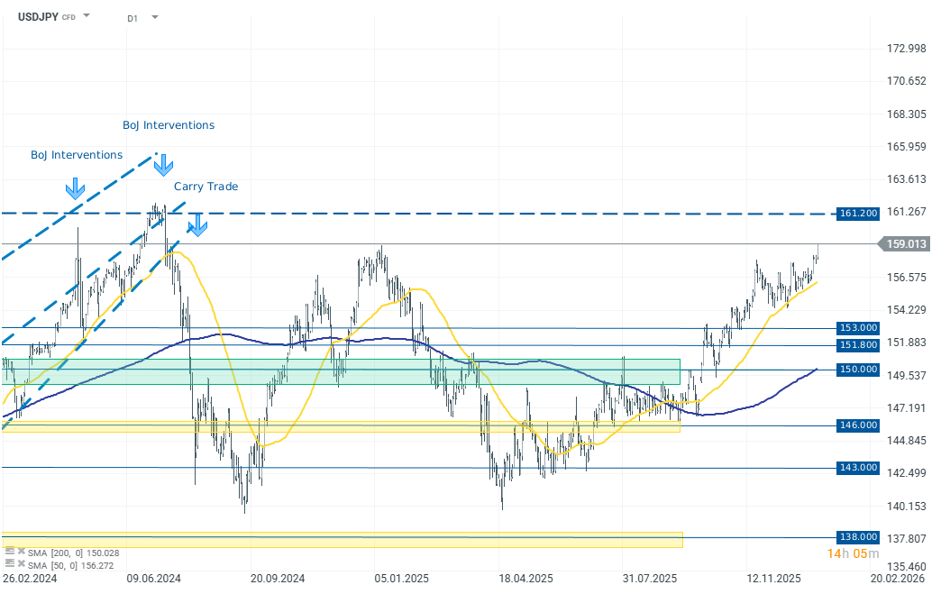 USDJPY is trading near multi-month highs, up 0.60% on the day to around 159.0000 at the time of writing, and approaching the psychological 160.00 level.