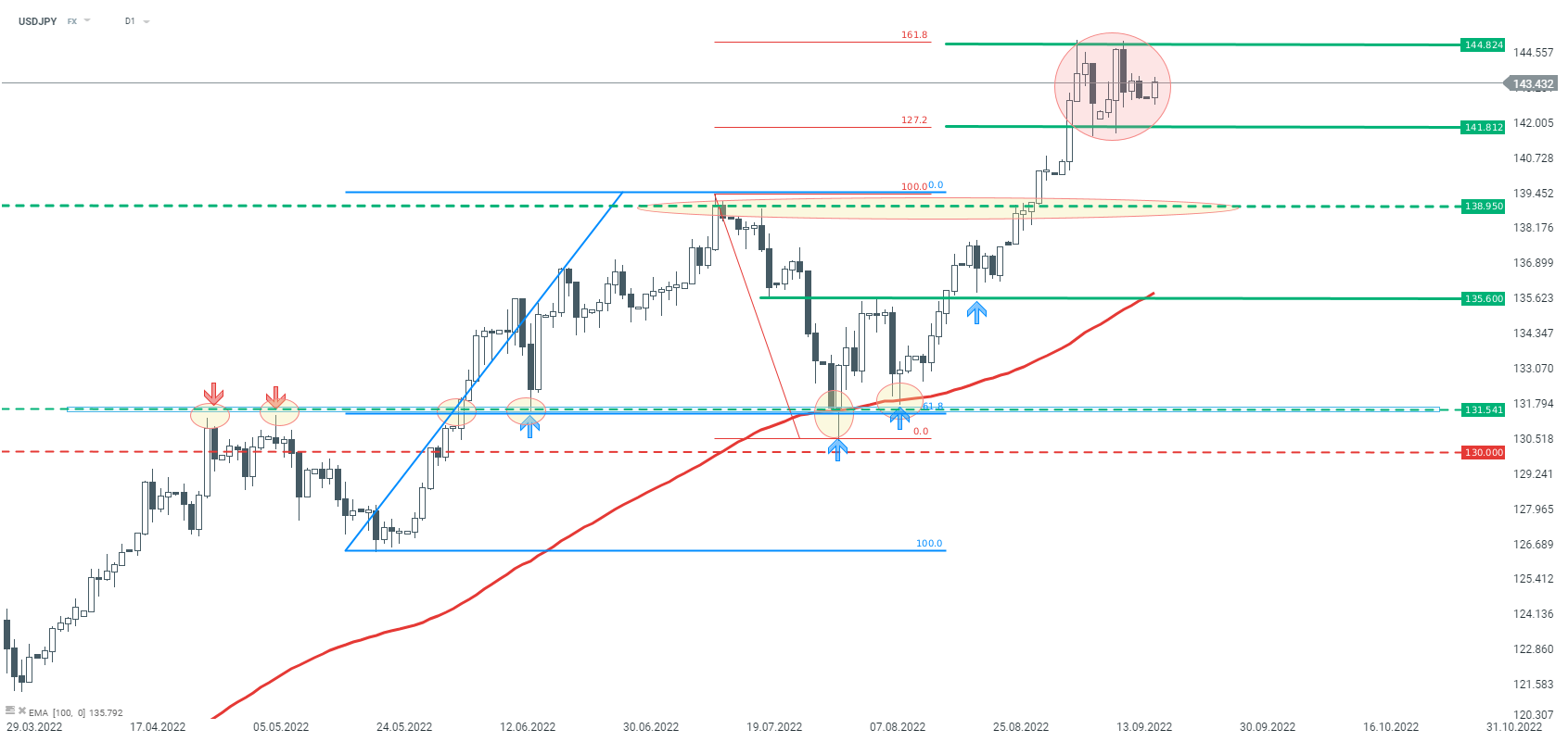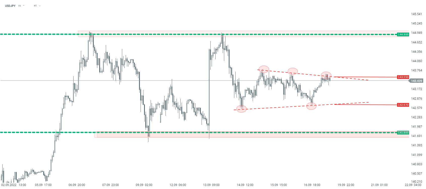 Looking at the lower time frame - H1, on the other hand, in the short term the focus should be on two levels - 143.55 and 142.67, which are the upper and lower limits of the local triangle formation (marked with red dotted lines). If one of them is defeated, a larger movement could be generated. If a downward breakout occurs, the move could reach the support zone at 141.80. On the other hand, in case of an upward breakout, the target for buyers could become the zone at 144.90.