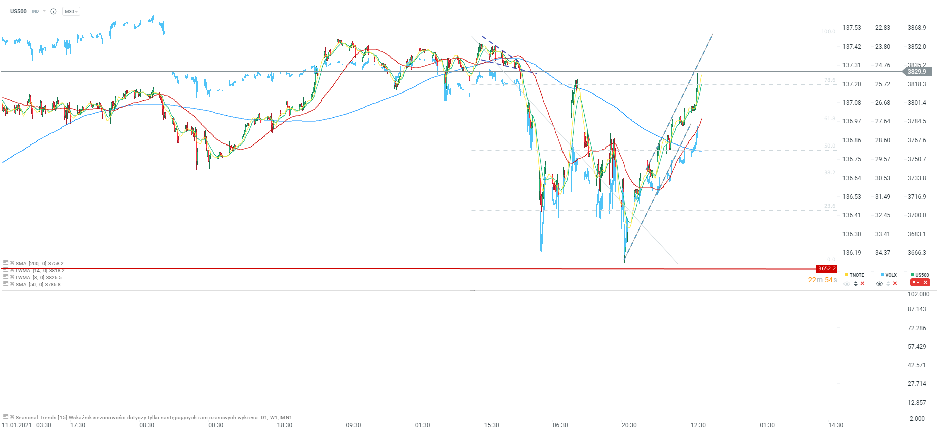 After the turbulent end of last week, the S&P 500 contracts opened with a bearish price gap on February 1, but began catching up immediately. Upbeat mood prevails today and is related not only to the decline in volatility on Wall Street (previously the VIX index rose significantly due to the short squeeze on some companies), but also to optimism regarding the vaccine. The results provided by AstraZeneca show that the use of a second dose of the vaccine after 3 months increases its effectiveness to 82.4%. AstraZeneca indicates that the possibility of taking the second dose after a relatively long period of time will make it possible to vaccinate a large number of people in the first round and increase its effectiveness in the second.