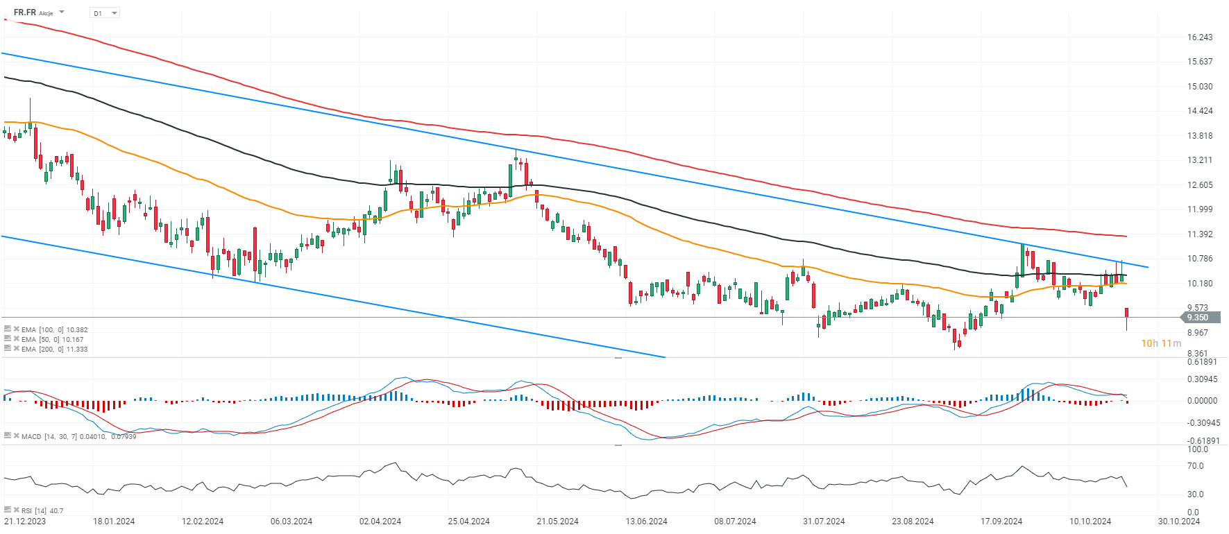 Shares of French auto parts producer Valeo (FR.FR) drops 10% as the company trimmed 2024 revenue forecast. Valeo now expects €21.3 billion, vs €22 billion previously. The revision follows a challenging Q3, marked by lower demand; sales dropped by 5% YoY to €4.97 billion. What's important, today overall sentiments across the automotive sector are weak, after Mercedes-Benz quarterly report.