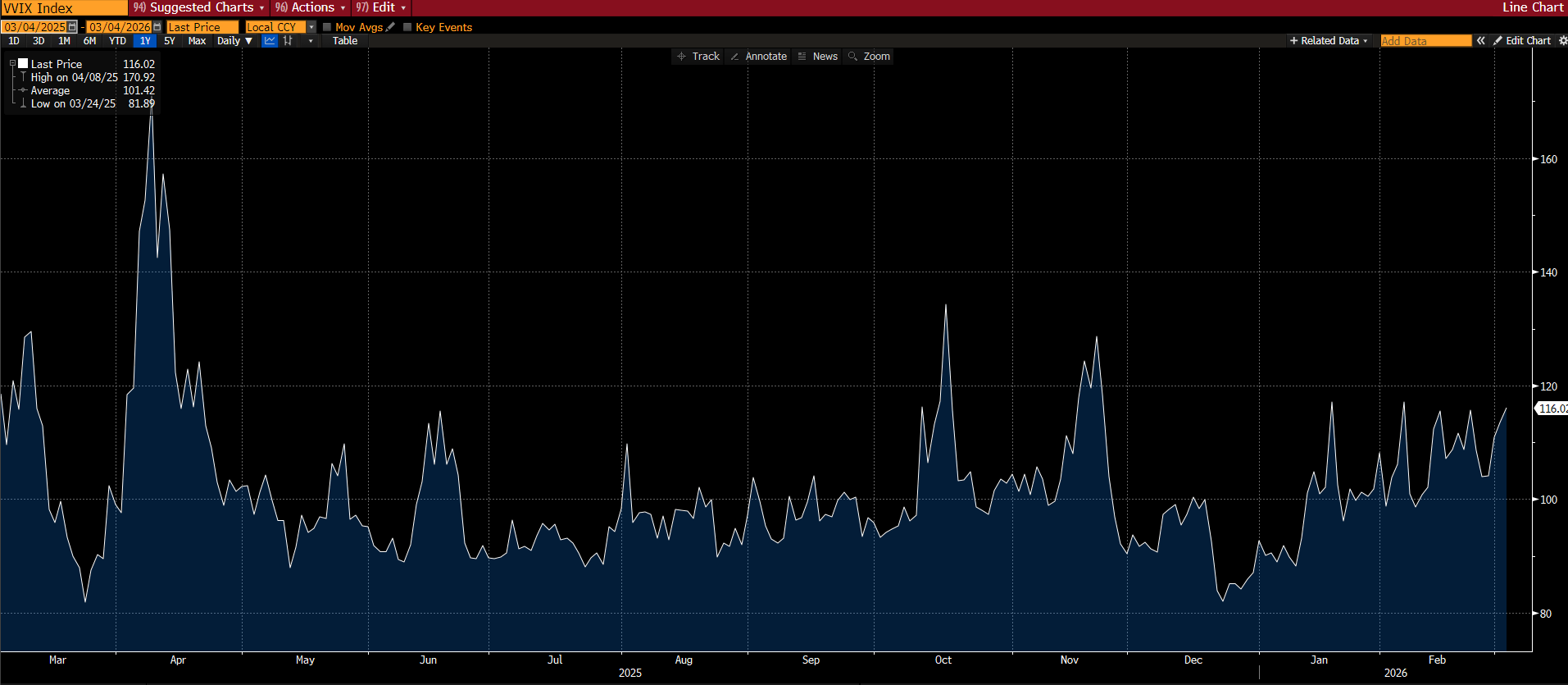 VVIX readings (the expected volatility of the volatility index itself) indicate strong demand for downside protection, although the market does not yet appear to be pricing in a probable crash — which would likely require VVIX above 130.