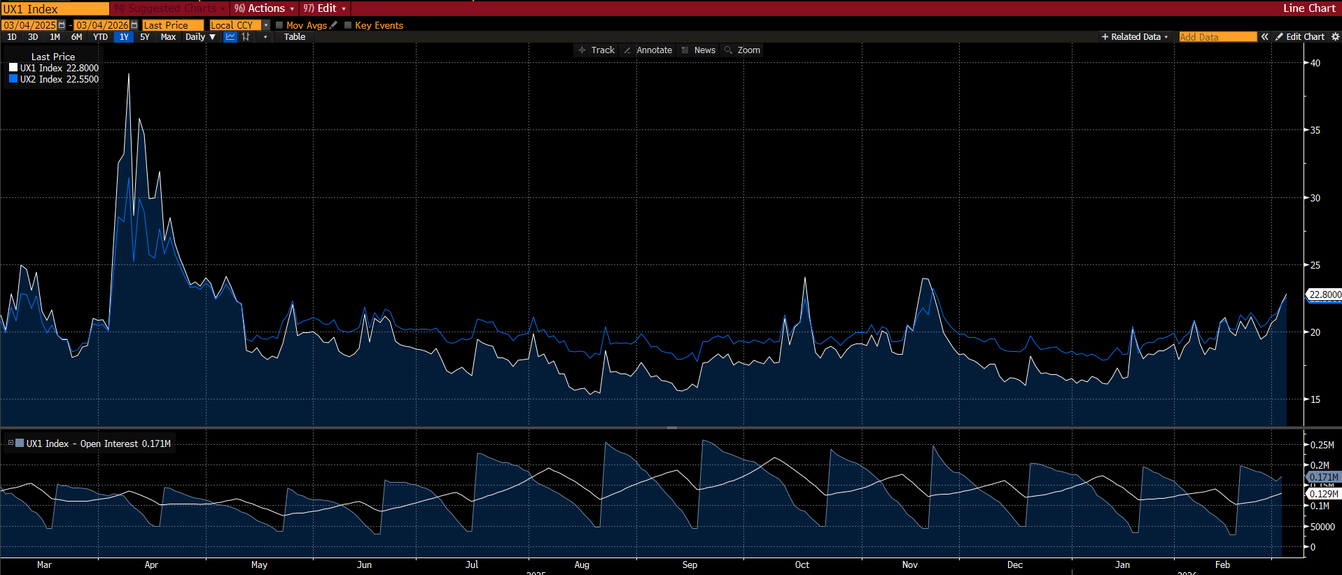 The spread between the front VIX futures contract and the next maturity shows only very mild backwardation (22.8 for UX1 vs 22.55 for UX2). This suggests that the market is pricing slightly elevated near-term risk, but remains far from anticipating a severe panic scenario. The volatility term structure remains relatively flat, pointing more to cautious short-term hedging than to expectations of a lasting volatility shock across markets.