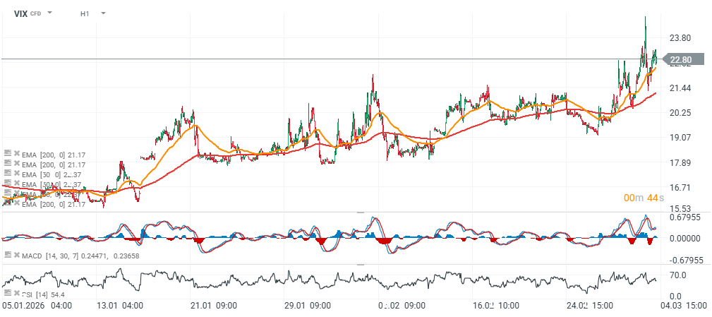 Looking at RSI, we can see a divergence - the indicator is cooling despite the index remaining in a clear upward trend. Meanwhile, the MACD structure suggests the possibility of short-term bearish momentum from the moving averages. On the other hand, on the hourly timeframe the VIX has pulled back to around 50, which could potentially leave room for another dynamic upward move.