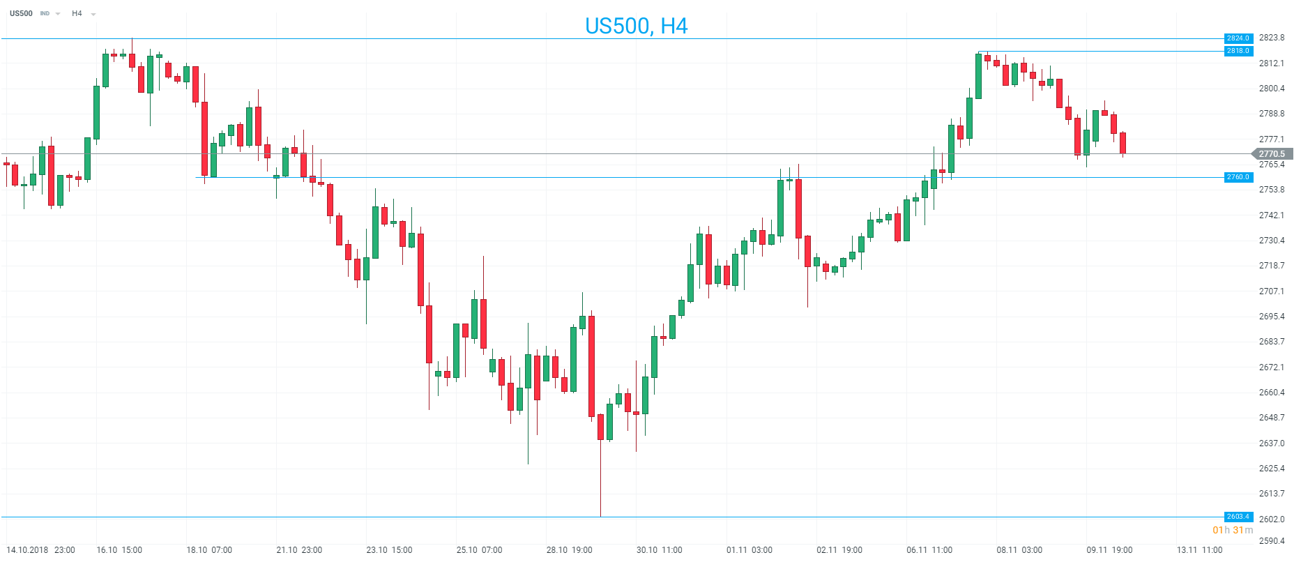 The US500 rallied fairly strongly last week after the midterm election results were known but the prior swing high around 2824 wasn’t breached to the upside and there is still a feeling that we may not have seen the end of the selling which caused the market to swoon in October. Price has fallen back near the 2760 level and this is a region to look to for possible support having previously attracted buyers before offering resistance last week. Following the election results the market made a clean break up through here and as such it could be important to see if the market can hold above it.