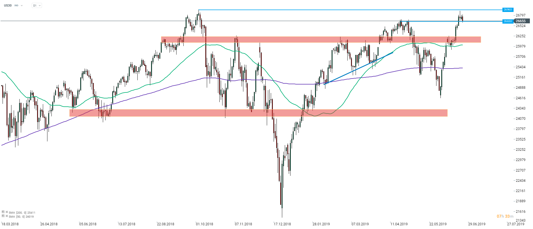 Dow Jones (US30) is the only one out of 3 major US indices that failed to print new highs during the second quarter of 2019. The index reversed slightly below last year’s peak of 26960 pts. US30 is currently testing the support level marked by a double top from April (26650 pts). Daily close below this hurdle could encourage bears to become more active and, in turn, deepen the decline. In such a scenario the next support to watch is the 26100-26250 pts zone. Source: xStation5