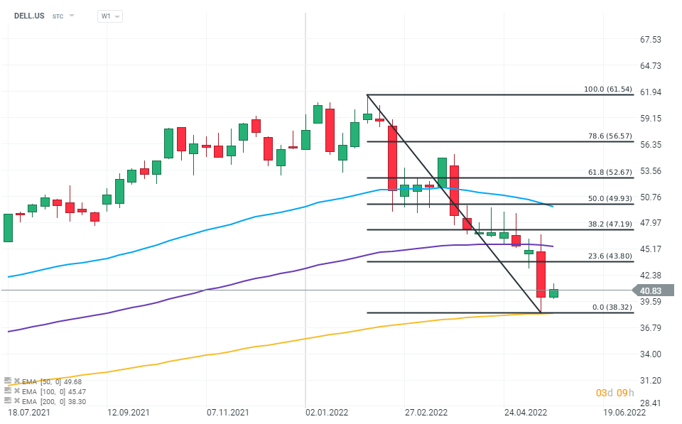 Dell Technologies (DELL.US) chart, W1 interval. Shares of the technology company stopped the wave of declines in the region of the 200-week exponential moving average (gold line), and at the moment bulls are trying to rebound from the recent declines. From a technical perspective, the most important support levels are currently the last low from last week, and resistance levels are the area near the 23.6% Fibo elimination. Source: xStation 5