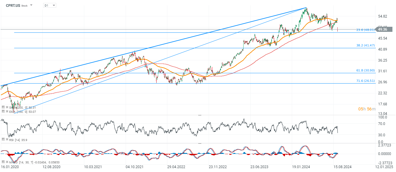 Shares of Copart, global provider of online vehicle auction and services related to automotive resellers such as insurance, car rental and credit are dropping today below SMA200 (red line), signalling at least short-term trend reversal. Despite strong quarterly report, investors are selling Copart amid valuation concerns and weakening economy fears