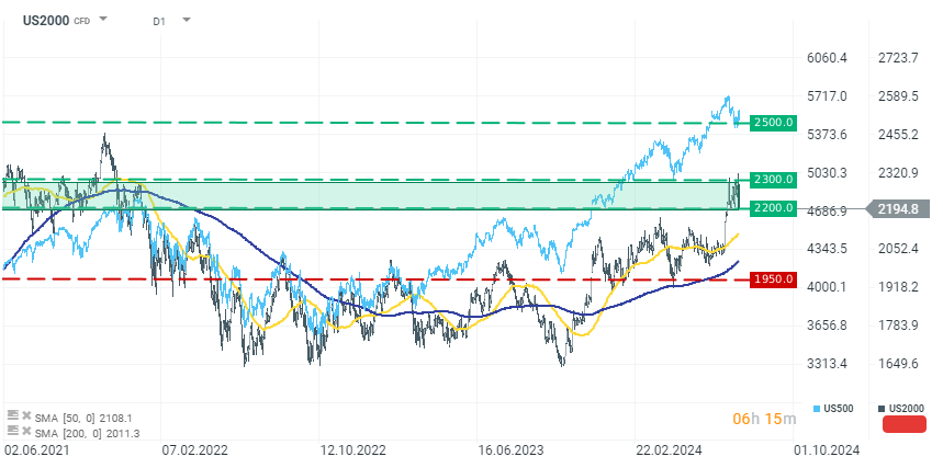 The US2000 index is currently testing the lower boundary of the recent consolidation range at 2200-2300 points. If the bears manage to break below it, we can expect to erase the remaining gains after the lower CPI report from the USA in mid-July, to levels around 2050 points. Otherwise, it will be crucial for the bulls to maintain the consolidation zone above 2200 points.