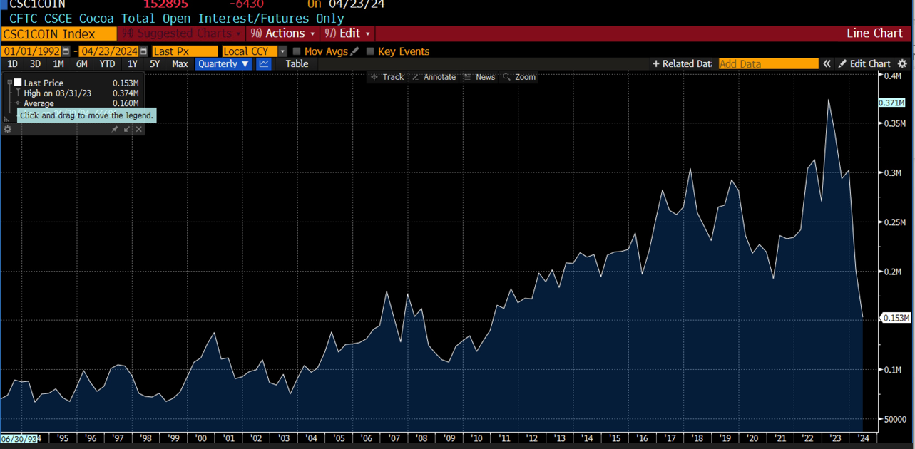 The reason for the volatility is not down to fundamentals, but rather traders exiting their positions. Higher margin calls, as the price has fallen back from $10,000 per tonne, along with a sharp decline in open interest futures positions, which are at their lowest level since 2010, as you can see in the chart below, have driven these extreme price moves. This does not suggest that the price of cocoa will be able to recover any time soon, and it could exacerbate the downside pressure. Thus, for now, cocoa is a sharp toy to play with.