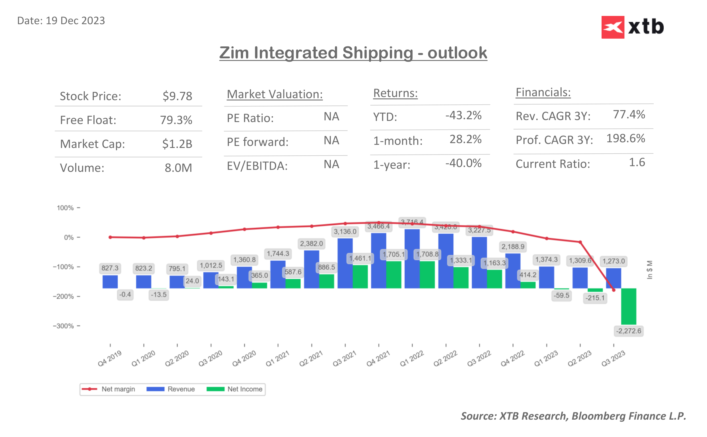 ZIM shares are trading at a near 50% discount to book value, with a very low price-to-sales ratio near 0.2. Source: XTB Research