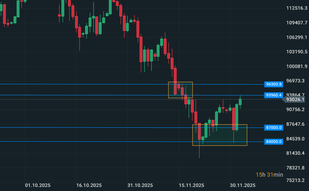 Grafico a timeframe giornaliero del Bitcoin e i livelli di supporto e resistenza tra 84000 e 96000 - Fonte: XStation - Studio: David Pascucci, XTB