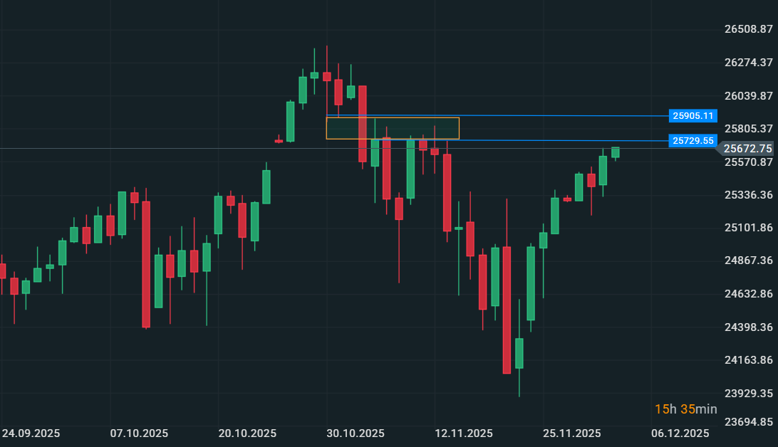 Questa dinamica si ripercuote anche su altri indici come ad esempio il Nasdaq che tra i 25700-25900 trova dei livelli parecchio battuti nel corso degli scorsi giorni. La dinamica del Nasdaq é piú aggressiva al rialzo, con la rottura rialzista dei massimi delle scorse due settimane, pertanto si potrebbe configurare una dinamica di rimbalzo che richiede ovviamente di essere testata proprio sui livelli segnalati. L'area infatti corrisponde a livelli massimi giornalieri visti tra il 5 e il 13 novembre, livelli che potrebbero essere appunto rilevanti per l'innesco di vendite a conferma della dinamica ribassista che vediamo anche sulla chiusura mensile di novembre, una chiusura negativa dopo il test dei massimi assoluti dell'anno.