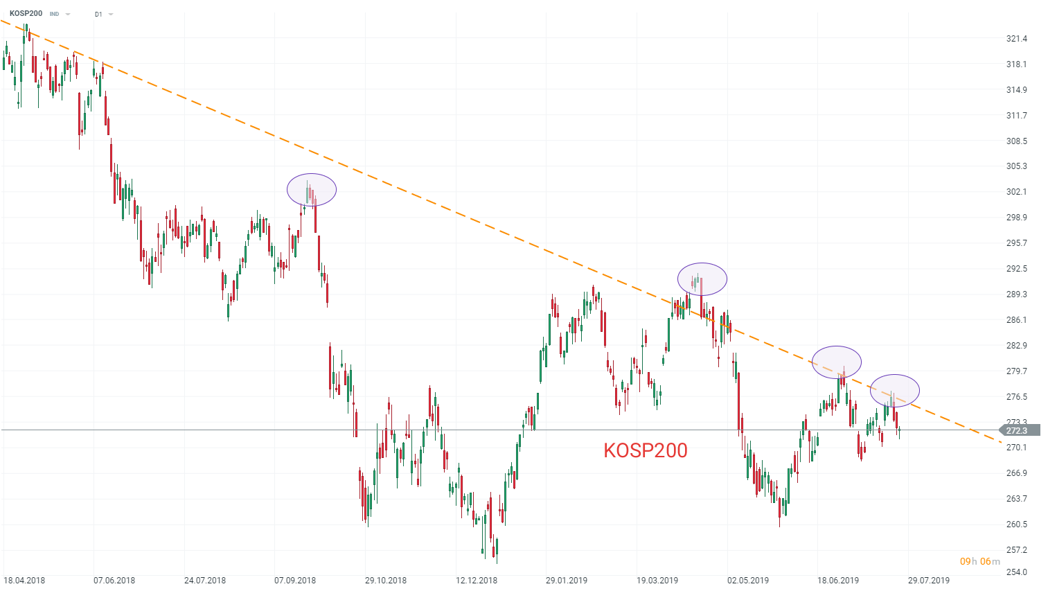 Gli investitori rimangono pessimisti nei confronti del mercato azionario coreano in cui il KOSP200 rimane in una tendenza al ribasso. Fonte: xStation5