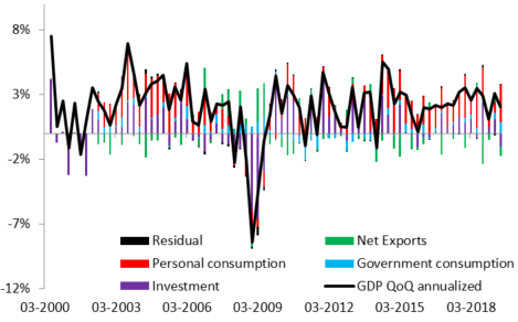 Il PIL del secondo trimestre degli Stati Uniti riguardava solo i consumi - privati e pubblici. Gli investimenti e il commercio si sono ritirati dalla crescita. Fonte: Macrobond, Ricerca XTB