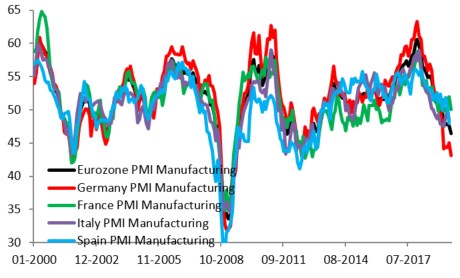 La manifattura tedesca è già ai minimi della crisi dell'euro con il resto dell'UEM che "sta prendendo piede". Fonte: Macrobond, Ricerca XTB