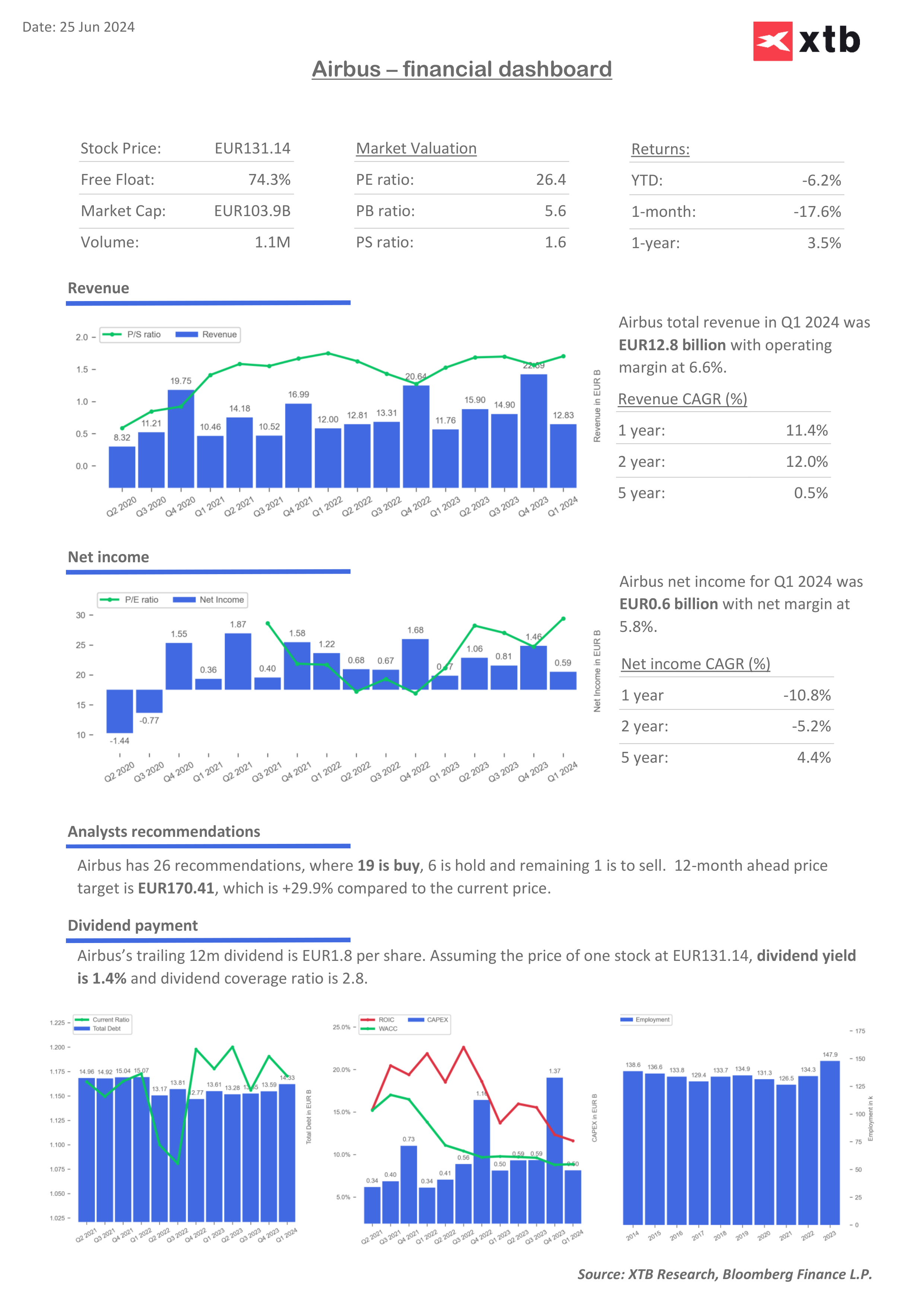 Le azioni del più grande conglomerato aerospaziale-industriale europeo Airbus (AIR.FR) sono scese oggi del 12%, poiché la società ha abbassato le sue previsioni finanziarie per l'intero anno 2024. Ora si aspetta profitti al lordo delle imposte inferiori e meno aerei da aggiungere alla sua flotta quest'anno. La società ha inoltre indicato che la decisione di abbassare le aspettative è stata influenzata dall'aumento dei costi nel segmento delle operazioni spaziali e dai problemi nella catena di fornitura (in particolare nei settori dei motori e delle apparecchiature di cabina).