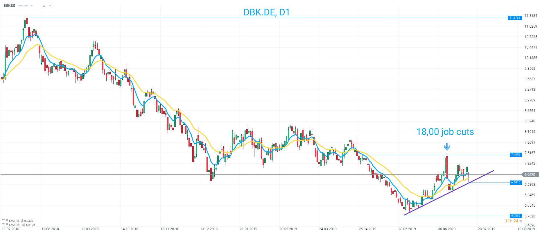 Le azioni di Deutsche Bank sono in ribasso di oltre il 5% poco dopo l'apertura questa mattina, ma da allora sono rimbalzate leggermente. Il mercato si sta semplicemente aggrappando alla tendenza rialzista in atto negli ultimi due mesi, definita dagli EMA 8/21 e da una linea di tendenza in aumento. I minimi giornalieri di 6,70 potrebbero essere visti come un supporto chiave per guardare avanti. Fonte: xStation