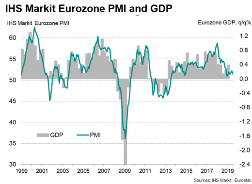 L'ultimo round di PMI dell'Eurozona ha deluso e indica un rallentamento non solo del blocco, ma anche dell'economia globale. Fonte: IHS Markit, Eurostat