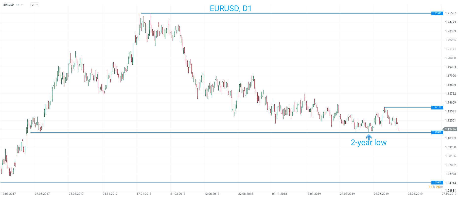 Non sorprende che l'Euro sia in ribasso a causa di questa notizia, la moneta unica è scesa al minimo di 2 mesi contro il dollaro USA poco dopo il rilascio. L'handle da $ 1,11 ha fornito un supporto in un paio di occasioni negli ultimi mesi, ma se il mercato scende al di sotto di questo livello, è necessario tornare indietro di oltre 2 anni a maggio 2017 per trovare un tasso di cambio più basso. Fonte: xStation