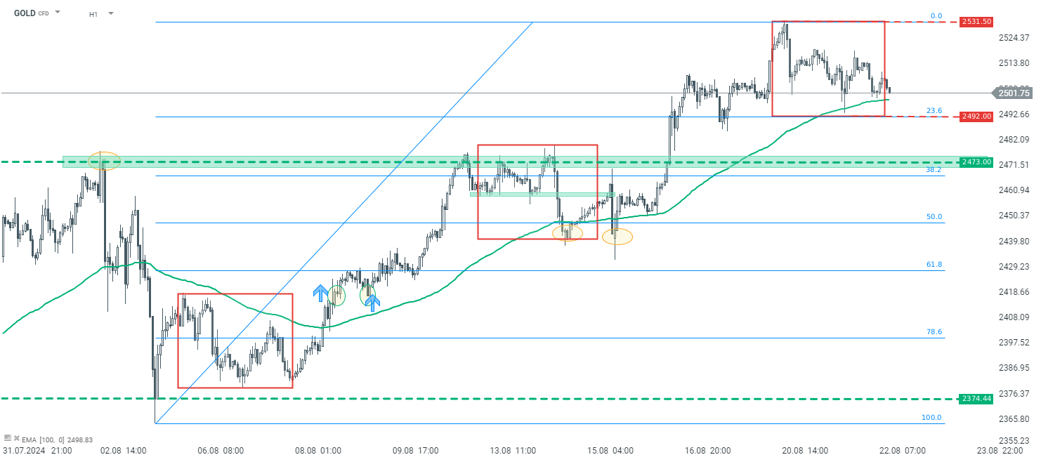 Scendendo ad un intervallo temporale inferiore – H1, osserviamo una tendenza al rialzo. Come supporto a breve termine, consideriamo il livello di 2492 dollari, che deriva dal limite inferiore del sistema 1:1 e dal rapporto del 23,6% dell’ultima ondata al rialzo. Se questo livello venisse annullato, la zona orizzontale a 2.473 dollari, derivante dai precedenti massimi locali, dovrebbe essere considerata come il prossimo supporto. Solo una discesa del prezzo al di sotto della zona sopra menzionata potrebbe portare a un cambiamento del sentiment a breve termine verso una tendenza al ribasso.