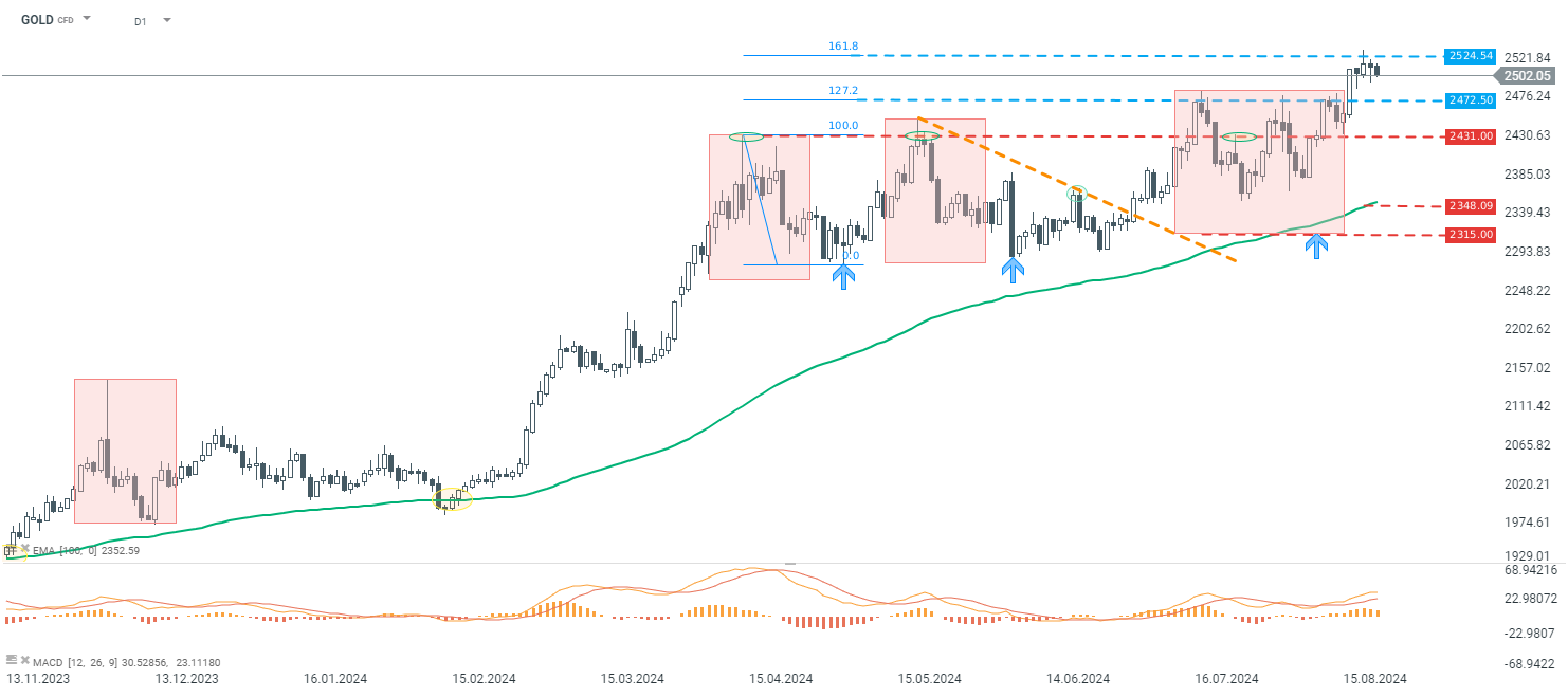 Le quotazioni dell'ORO si muovono con una tendenza al rialzo da un bel po' di tempo. Osservando l'intervallo D1, il prezzo ha stabilito nuovi massimi questa settimana. Tuttavia, il movimento al rialzo si è fermato al fattore esterno del 161,8% di una delle ultime importanti correzioni, e il livello di 2524,5 dollari dovrebbe essere considerato come una resistenza a breve termine. Se si generasse una correzione al ribasso, il livello di 2472,5 dollari, che deriva dai precedenti massimi locali, dovrebbe essere preso come primo supporto. Se il movimento al ribasso dovesse prolungarsi, i livelli di 2431$ e 2348$ dovrebbero essere considerati rispettivamente come supporto successivo.
