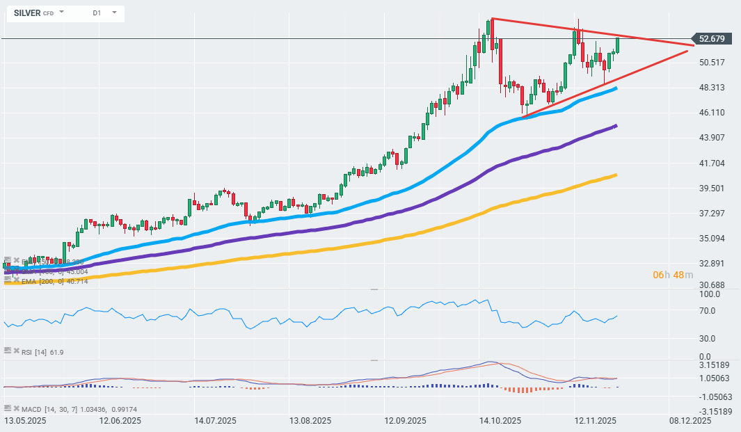 Osservando l’RSI, possiamo notare che, nonostante un solido rimbalzo, il valore di 60 sulla media a 14 giorni non indica eccessiva euforia, il che, insieme al quadro positivo del MACD, lascia spazio a ulteriori rialzi. È importante sottolineare che il prezzo ha costruito un forte supporto intorno a 46 £ l’oncia. Allo stesso tempo, si osserva la formazione di minimi crescenti. I prezzi dell’argento sembrano muoversi all’interno di una figura triangolare, in cui il livello di 53 £ potrebbe rivelarsi una zona chiave. Se il prezzo non riuscisse a superare questa soglia, potrebbe seguire un ritorno dinamico verso ribassi. Tuttavia, se il prezzo dovesse salire sopra questa zona, si tratterebbe di un breakout da manuale della formazione rialzista. In tale scenario, il prezzo potrebbe riprendere il movimento verso i massimi storici intorno a 54,5 $ e superarli, se persistesse l’ottimismo sui tagli dei tassi negli Stati Uniti e il sentiment “anti-dollaro”.
