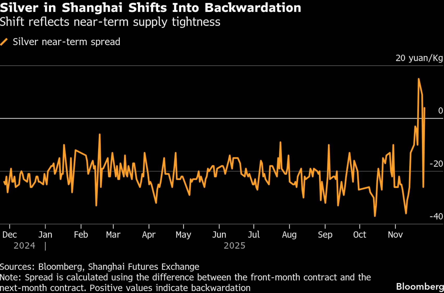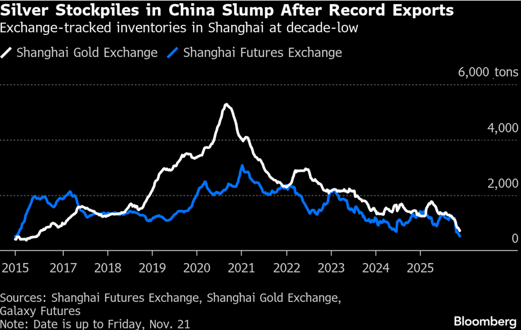 Il mercato dell’argento si trova sull’orlo di un problema strutturale temporaneo, poiché le riserve di metallo in Cina sono scese ai livelli più bassi degli ultimi dieci anni, mentre le esportazioni di argento dalla Cina verso Londra hanno raggiunto un record di 660 tonnellate a ottobre, aggravando ulteriormente un mercato già teso. Le scorte alla Shanghai Futures Exchange e alla Shanghai Gold Exchange sono crollate – le prime ai livelli più bassi dal 2015, le seconde ai minimi da oltre nove anni – segnalando problemi fondamentali di disponibilità del metallo sul mercato. Gli analisti di Jinrui Futures sottolineano che la carenza è dovuta alla crescente domanda di esportazioni, oltre che all’aumento della richiesta da parte dell’industria e del settore orafo, soprattutto durante la stagione delle installazioni fotovoltaiche; la scarsità dovrebbe continuare nei prossimi due mesi.