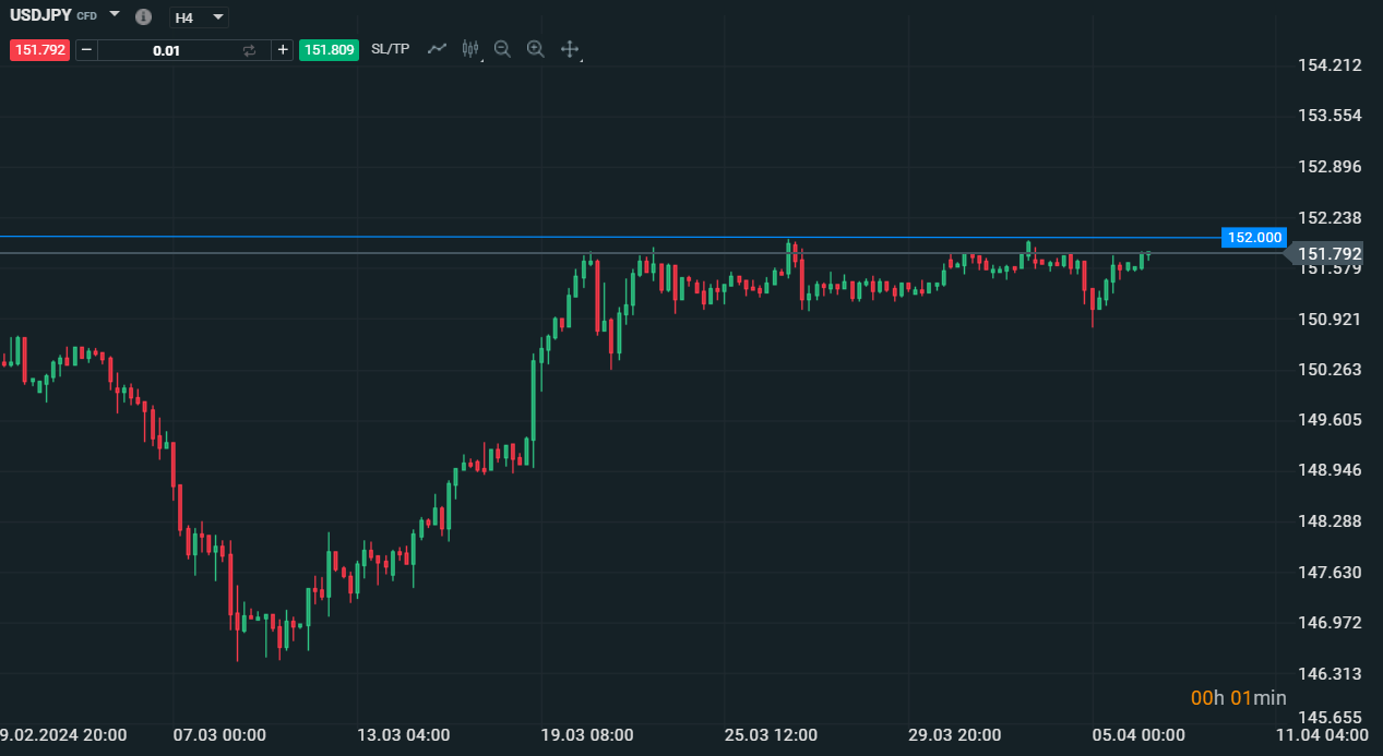 Sul Forex il protagonista indiscusso rimane sempre UsdJpy che, a differenza di EurUsd e GbpUsd che rimangono sempre all’interno di zone di compressione, cerca di rompere una barriera a dir poco fondamentale che é quella dei 152. Negli ultimi giorni di negoziazione il mercato sta tentando di portare sempre il cambio verso la rottura di questo livello con frequenti test dell’area 151,90, tutti test che per il momento hanno visto solamente delle repulsioni anche forti, movimenti ribassisti prontamente riassorbiti dal mercato e che fanno presagire proprio alla volontá di vedere la rottura di quest’area. L’attenzione su questo cambio é massima.