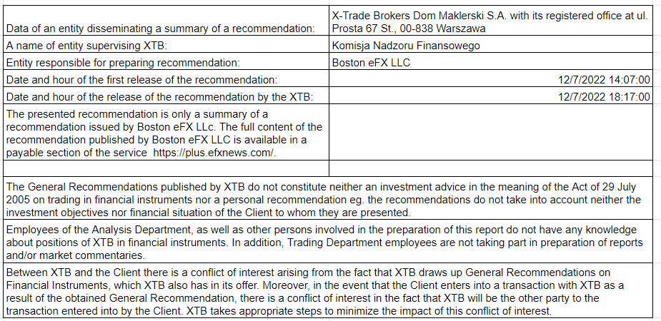Questo materiale è una comunicazione di marketing ai sensi dell'Art. 24, paragrafo 3, della direttiva 2014/65 / UE del Parlamento europeo e del Consiglio, del 15 maggio 2014, relativa ai mercati degli strumenti finanziari e che modifica la direttiva 2002/92 / CE e la direttiva 2011/61 / UE (MiFID II). La comunicazione di marketing non è una raccomandazione di investimento o informazioni che raccomandano o suggeriscono una strategia di investimento ai sensi del regolamento (UE) n. 596/2014 del Parlamento europeo e del Consiglio, del 16 aprile 2014, relativo agli abusi di mercato (regolamento sugli abusi di mercato) e che abroga la direttiva 2003/6 / CE del Parlamento europeo e del Consiglio e direttive della Commissione 2003/124 / CE, 2003/125 / CE e 2004/72 / CE e regolamento delegato (UE) 2016/958 della Commissione, del 9 marzo 2016, che integra il regolamento UE) n. 596/2014 del Parlamento europeo e del Consiglio per quanto riguarda le norme tecniche di regolamentazione per le disposizioni tecniche per la presentazione obiettiva di raccomandazioni di investimento o altre informazioni che raccomandano o suggeriscono una strategia di investimento e per la divulgazione di particolari interessi o indicazioni di conflitti di interessi o qualsiasi altra consulenza, anche nell'ambito della consulenza sugli investimenti, ai sensi della legge sugli strumenti finanziari del 29 luglio 2005 (ad es. Journal of Laws 2019, voce 875, come modificata). La comunicazione di marketing è preparata con la massima diligenza, obiettività, presenta i fatti noti all'autore alla data di preparazione ed è priva di elementi di valutazione. La comunicazione di marketing viene preparata senza considerare le esigenze del cliente, la sua situazione finanziaria individuale e non presenta alcuna strategia di investimento in alcun modo. La comunicazione di marketing non costituisce un'offerta di vendita, offerta, abbonamento, invito all'acquisto, pubblicità o promozione di strumenti finanziari. XTB S.A. non è responsabile per eventuali azioni o omissioni del cliente, in particolare per l'acquisizione o la cessione di strumenti finanziari. XTB non si assume alcuna responsabilità per qualsiasi perdita o danno, anche senza limitazione, eventuali perdite, che possono insorgere direttamente o indirettamente, intrapresa sulla base delle informazioni contenute in questa comunicazione di marketing. Nel caso in cui la comunicazione di marketing contenga informazioni su eventuali risultati relativi agli strumenti finanziari ivi indicati, questi non costituiscono alcuna garanzia o previsione relativa ai risultati futuri. Le prestazioni passate non sono necessariamente indicative dei risultati futuri, e chiunque agisca su queste informazioni lo fa interamente a proprio rischio.