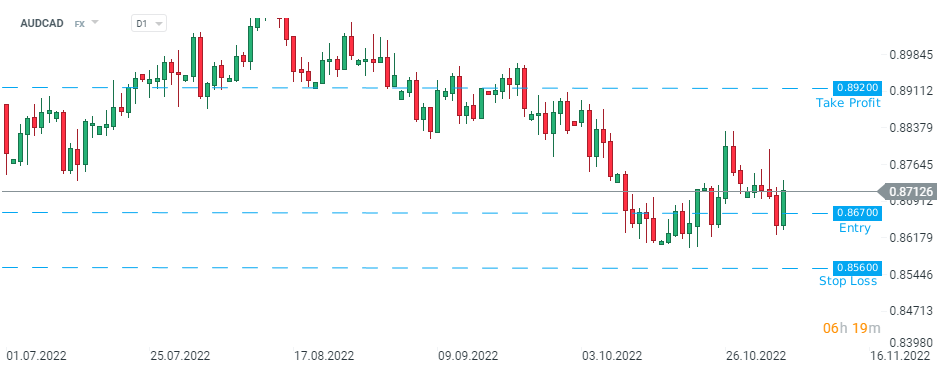 MUFG consiglia di aprire un limit order Long su AUDCAD a 0,8670 con un obiettivo di 0,8920 e un ordine stop loss collocato a 0,8560. Fonte: xStation5