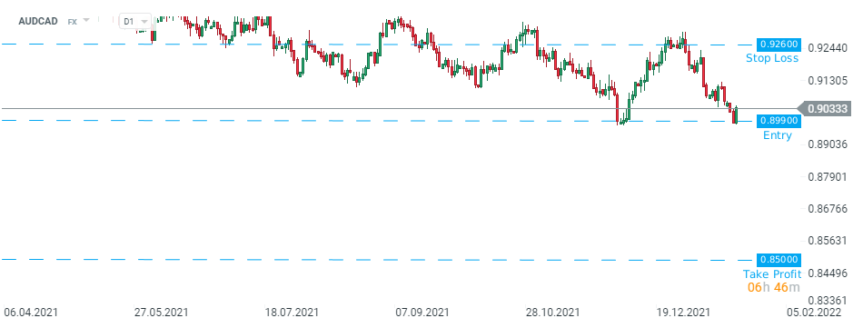 Nomura consiglia di aprire una posizione Short su AUDCAD a 0,8990 con un obiettivo di 0,8500 e uno stop loss collocato a 0,9260. Fonte: xStation5