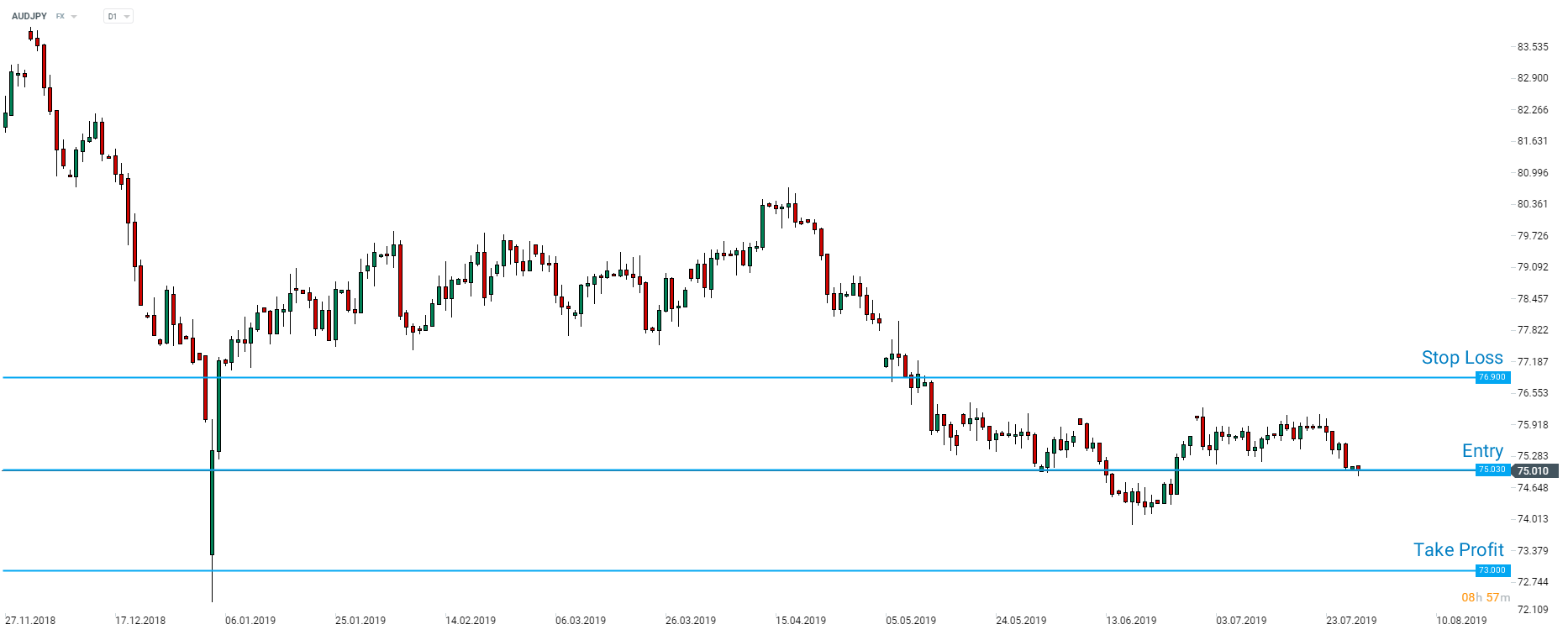 Deutsche Bank raccomanda di prendere una posizione short su AUDJPY al prezzo di mercato con un obiettivo di 73,00 e un ordine di stop loss collocato a 76,90. Fonte: xStation5