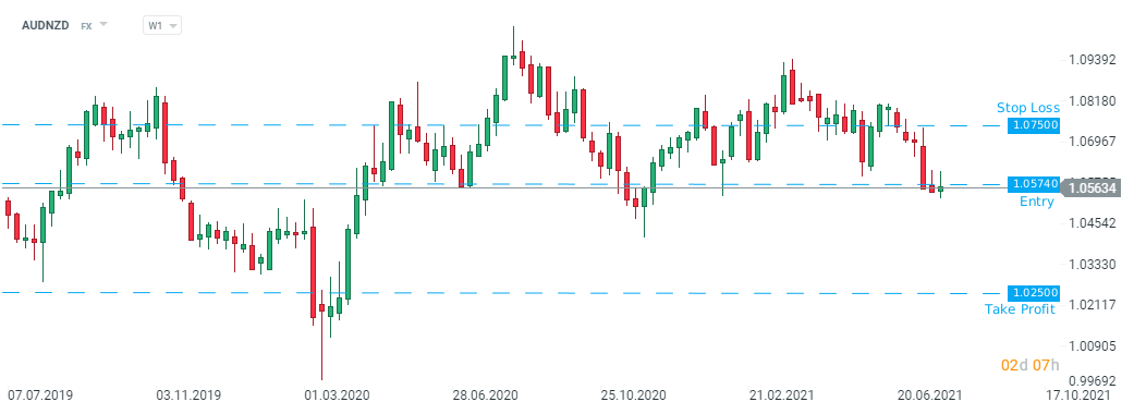 MUFG consiglia di aprire una posizione Short su AUDNZD a 1,0574 con un obiettivo di 1,0250 e un ordine di stop loss collocato a 1,0750. Fonte: xStation5