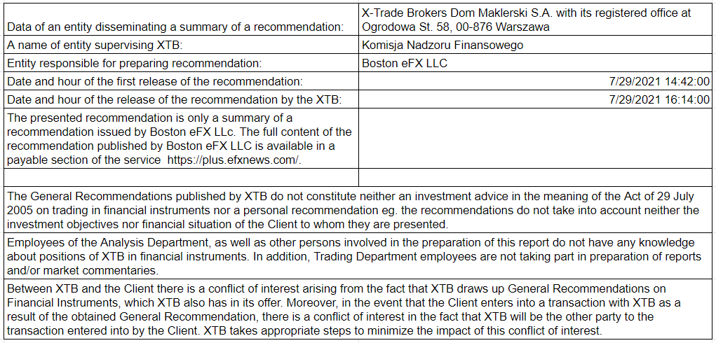 Questo materiale è una comunicazione di marketing ai sensi dell'Art. 24, paragrafo 3, della direttiva 2014/65 / UE del Parlamento europeo e del Consiglio, del 15 maggio 2014, relativa ai mercati degli strumenti finanziari e che modifica la direttiva 2002/92 / CE e la direttiva 2011/61 / UE (MiFID II). La comunicazione di marketing non è una raccomandazione di investimento o informazioni che raccomandano o suggeriscono una strategia di investimento ai sensi del regolamento (UE) n. 596/2014 del Parlamento europeo e del Consiglio, del 16 aprile 2014, relativo agli abusi di mercato (regolamento sugli abusi di mercato) e che abroga la direttiva 2003/6 / CE del Parlamento europeo e del Consiglio e direttive della Commissione 2003/124 / CE, 2003/125 / CE e 2004/72 / CE e regolamento delegato (UE) 2016/958 della Commissione, del 9 marzo 2016, che integra il regolamento UE) n. 596/2014 del Parlamento europeo e del Consiglio per quanto riguarda le norme tecniche di regolamentazione per le disposizioni tecniche per la presentazione obiettiva di raccomandazioni di investimento o altre informazioni che raccomandano o suggeriscono una strategia di investimento e per la divulgazione di particolari interessi o indicazioni di conflitti di interessi o qualsiasi altra consulenza, anche nell'ambito della consulenza sugli investimenti, ai sensi della legge sugli strumenti finanziari del 29 luglio 2005 (ad es. Journal of Laws 2019, voce 875, come modificata). La comunicazione di marketing è preparata con la massima diligenza, obiettività, presenta i fatti noti all'autore alla data di preparazione ed è priva di elementi di valutazione. La comunicazione di marketing viene preparata senza considerare le esigenze del cliente, la sua situazione finanziaria individuale e non presenta alcuna strategia di investimento in alcun modo. La comunicazione di marketing non costituisce un'offerta di vendita, offerta, abbonamento, invito all'acquisto, pubblicità o promozione di strumenti finanziari. XTB S.A. non è responsabile per eventuali azioni o omissioni del cliente, in particolare per l'acquisizione o la cessione di strumenti finanziari. XTB non si assume alcuna responsabilità per qualsiasi perdita o danno, anche senza limitazione, eventuali perdite, che possono insorgere direttamente o indirettamente, intrapresa sulla base delle informazioni contenute in questa comunicazione di marketing. Nel caso in cui la comunicazione di marketing contenga informazioni su eventuali risultati relativi agli strumenti finanziari ivi indicati, questi non costituiscono alcuna garanzia o previsione relativa ai risultati futuri. Le prestazioni passate non sono necessariamente indicative dei risultati futuri, e chiunque agisca su queste informazioni lo fa interamente a proprio rischio.