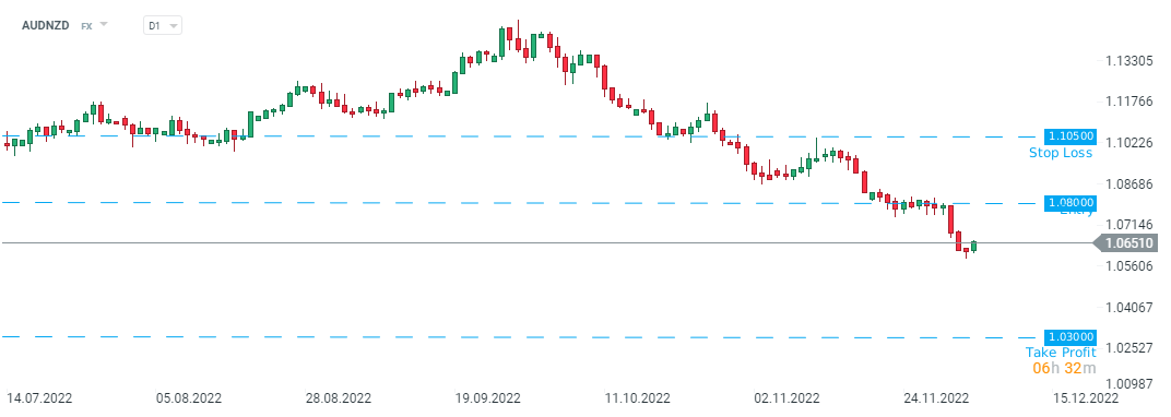 Société Générale consiglia di aprire limit order short su AUDNZD a 1,0800 con un obiettivo di 1,0300 e un ordine di stop loss collocato a 1,1050. Fonte: xStation5