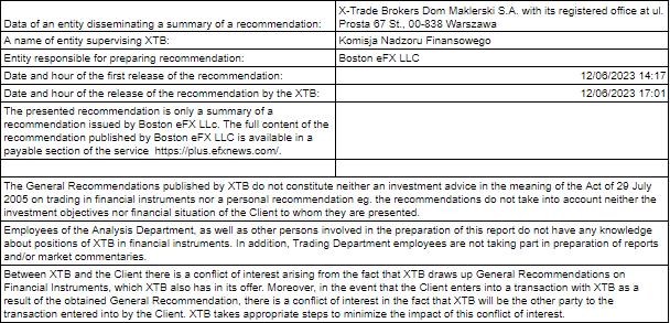 Questo materiale è una comunicazione di marketing ai sensi dell'Art. 24, paragrafo 3, della direttiva 2014/65 / UE del Parlamento europeo e del Consiglio, del 15 maggio 2014, relativa ai mercati degli strumenti finanziari e che modifica la direttiva 2002/92 / CE e la direttiva 2011/61 / UE (MiFID II). La comunicazione di marketing non è una raccomandazione di investimento o informazioni che raccomandano o suggeriscono una strategia di investimento ai sensi del regolamento (UE) n. 596/2014 del Parlamento europeo e del Consiglio, del 16 aprile 2014, relativo agli abusi di mercato (regolamento sugli abusi di mercato) e che abroga la direttiva 2003/6 / CE del Parlamento europeo e del Consiglio e direttive della Commissione 2003/124 / CE, 2003/125 / CE e 2004/72 / CE e regolamento delegato (UE) 2016/958 della Commissione, del 9 marzo 2016, che integra il regolamento UE) n. 596/2014 del Parlamento europeo e del Consiglio per quanto riguarda le norme tecniche di regolamentazione per le disposizioni tecniche per la presentazione obiettiva di raccomandazioni di investimento o altre informazioni che raccomandano o suggeriscono una strategia di investimento e per la divulgazione di particolari interessi o indicazioni di conflitti di interessi o qualsiasi altra consulenza, anche nell'ambito della consulenza sugli investimenti, ai sensi della legge sugli strumenti finanziari del 29 luglio 2005 (ad es. Journal of Laws 2019, voce 875, come modificata). La comunicazione di marketing è preparata con la massima diligenza, obiettività, presenta i fatti noti all'autore alla data di preparazione ed è priva di elementi di valutazione. La comunicazione di marketing viene preparata senza considerare le esigenze del cliente, la sua situazione finanziaria individuale e non presenta alcuna strategia di investimento in alcun modo. La comunicazione di marketing non costituisce un'offerta di vendita, offerta, abbonamento, invito all'acquisto, pubblicità o promozione di strumenti finanziari. XTB S.A. non è responsabile per eventuali azioni o omissioni del cliente, in particolare per l'acquisizione o la cessione di strumenti finanziari. XTB non si assume alcuna responsabilità per qualsiasi perdita o danno, anche senza limitazione, eventuali perdite, che possono insorgere direttamente o indirettamente, intrapresa sulla base delle informazioni contenute in questa comunicazione di marketing. Nel caso in cui la comunicazione di marketing contenga informazioni su eventuali risultati relativi agli strumenti finanziari ivi indicati, questi non costituiscono alcuna garanzia o previsione relativa ai risultati futuri. Le prestazioni passate non sono necessariamente indicative dei risultati futuri, e chiunque agisca su queste informazioni lo fa interamente a proprio rischio.