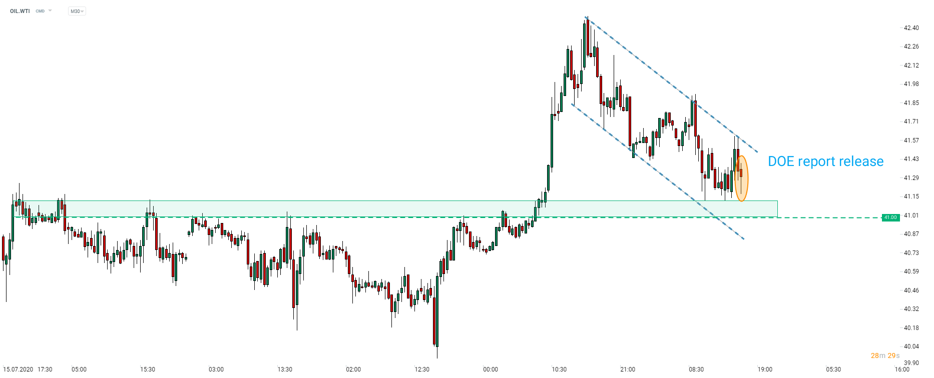 OIL.WTI si trova in un canale discendente a breve termine. Il prezzo si è spostato verso la zona di supporto a $ 41 in seguito al rilascio del rapporto DOE. Tuttavia, WTI ha iniziato a recuperare in seguito. Source: xStation5