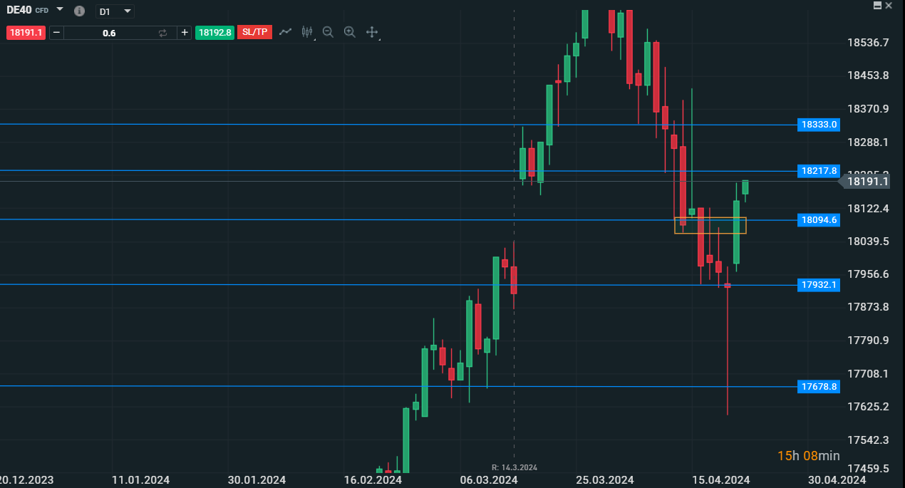 Grafico daily di Dax con i livelli massimi di riferimento per la giornata tra i 18220-18300 - Fonte: XStation