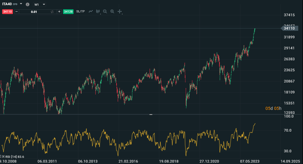 RSI in giallo sui massimi storici. Grafico settimanale di FTSE MIB - Fonte: XStation