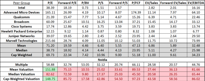 Successivamente, diamo un'occhiata a come Nvidia si confronta con i concorrenti. Abbiamo creato un gruppo di pari composto da 8 società, menzionate come concorrenti di Nvidia nel recente rapporto annuale. Il gruppo comprende Intel, Advanced Micro Devices, Qualcomm, Broadcom, Cisco Systems, Hewlett Packard Enterprise, Juniper Networks e Marvell Technology. Abbiamo esaminato una serie di multipli finali e forward diversi.