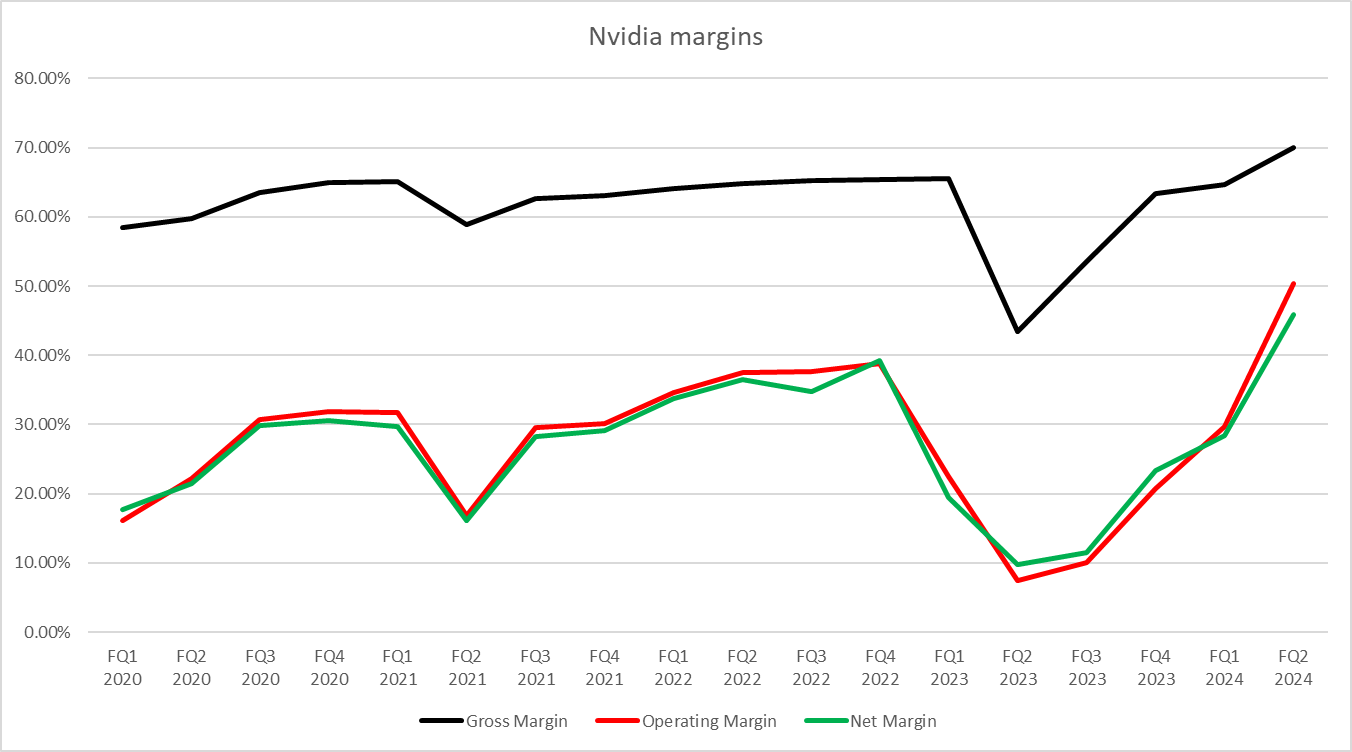 Nvidia ha riportato un altro trimestre di successo con la pubblicazione degli utili fiscali del secondo trimestre (calendario maggio-luglio 2024). I ricavi durante il trimestre sono cresciuti del 122,4% rispetto al trimestre di un anno fa e hanno superato i 30 miliardi di dollari, guidati da un aumento del 154,5% su base annua dei ricavi dei Data Center. Il margine lordo rettificato è migliorato dal 71,2% del secondo trimestre fiscale 2024 al 75,7% attuale, aprendo la strada a una crescita dell’utile lordo più rapida delle vendite (136,4% su base annua), suggerendo un ulteriore miglioramento dell’efficienza. Un miglioramento continuo è stato notato anche nel margine operativo, indicando una migliore disciplina dei costi. Ciò ha consentito all’utile netto rettificato di salire di oltre il 150% su base annua e all’EPS diluito di salire da $ 0,27 nel secondo trimestre fiscale 2024 a $ 0,68.