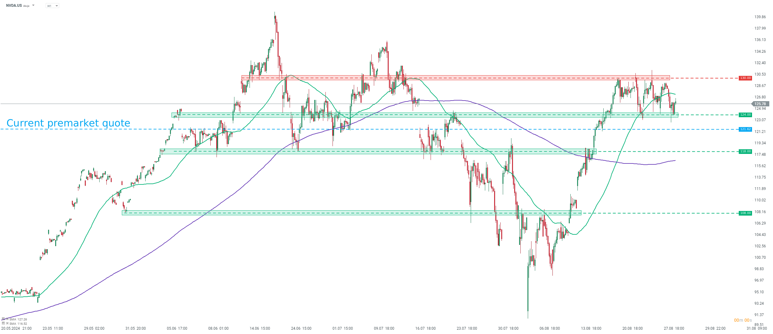 Ultimo ma non meno importante, diamo una rapida occhiata alla situazione sul grafico Nvidia (NVDA.US). Dando un'occhiata al grafico nell'intervallo del primo semestre, possiamo vedere che il titolo è stato scambiato lateralmente nell'intervallo $ 124-130 negli ultimi giorni in un contesto di incertezza sui pre-utili. L'attuale quotazione pre-mercato suggerisce un gap di prezzo ribassista di circa il 3% all'avvio della sessione di negoziazione di oggi. Tuttavia, dato che il rapporto sugli utili rilasciato dalla società non era affatto negativo e che il titolo era scambiato in ribasso del 6-7% nelle contrattazioni after-hour di ieri, c'è la possibilità che questo calo venga ulteriormente ridotto prima della liquidità di oggi. apertura della sessione.