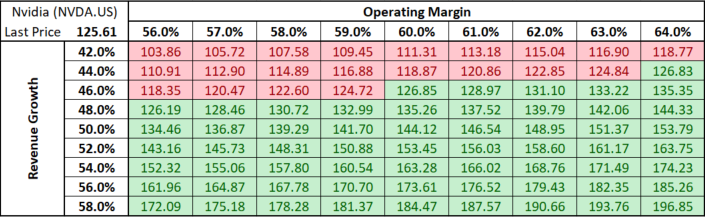 Un punto da notare è che il valore intrinseco ottenuto tramite il metodo DCF è altamente sensibile alle ipotesi formulate. Di seguito vengono fornite due matrici di sensibilità: una per diversi set di ipotesi di margine operativo e crescita dei ricavi e l'altra per diversi set di ipotesi di WACC terminale e crescita dei ricavi terminali.