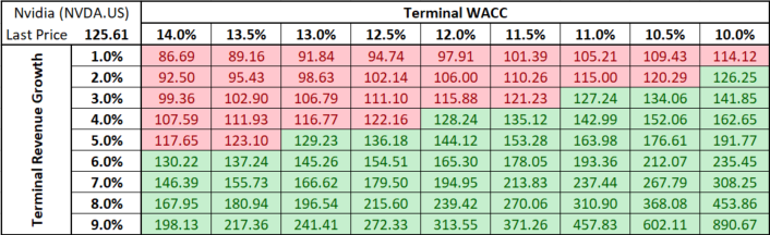 Poiché il valore terminale tende a rappresentare una parte significativa della valutazione DCF, soprattutto con periodi più brevi di previsioni dettagliate, abbiamo deciso di adottare un approccio molto conservativo in questo caso. Per i calcoli del valore terminale abbiamo utilizzato una crescita dei ricavi del 5% e un WACC terminale del 12%, in calo rispetto al WACC del 13% utilizzato per 5 anni di previsioni per catturare l’effetto della maturazione del business dell’IA. Va detto che la previsione di crescita dei ricavi dei terminali del 5% era molto conservativa e la decisione di fare un'ipotesi così conservativa mirava a non distorcere troppo la valutazione DCF.