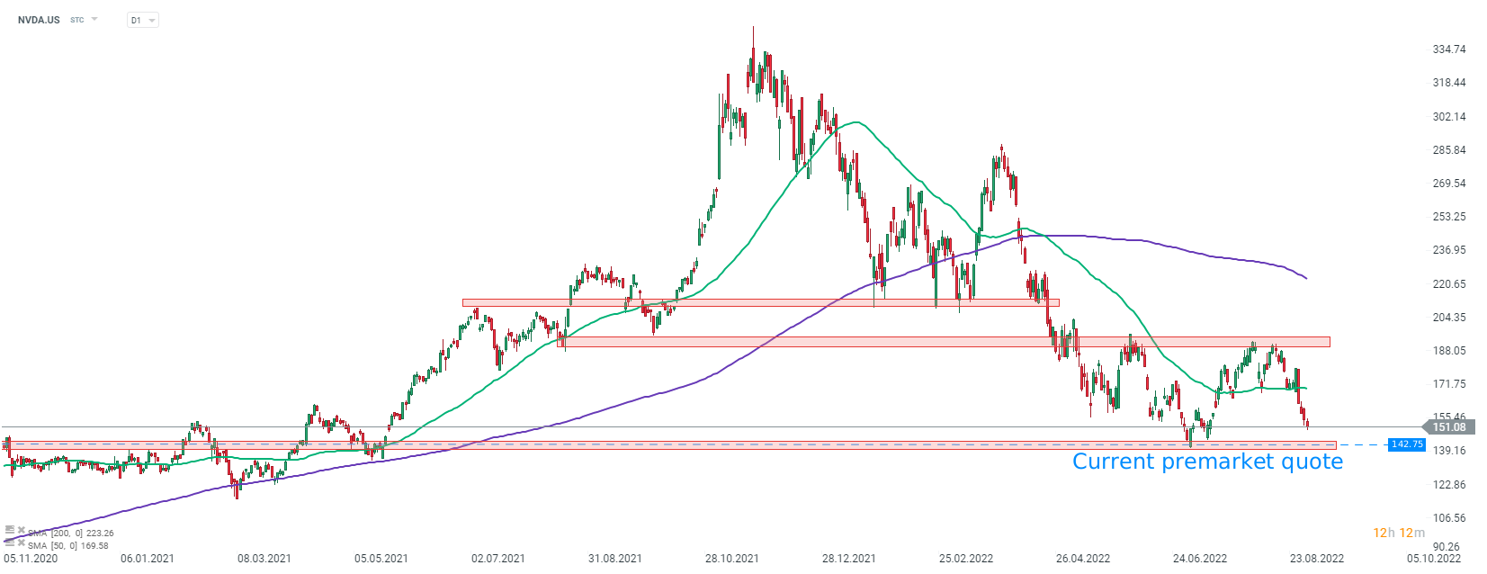 Secondo le attuali quotazioni pre-mercato, NVIDIA (NVDA.US) inizierà il trading di oggi vicino ai minimi recenti, circa il 5,5% in meno rispetto al prezzo di chiusura di ieri. Fonte: xStation5