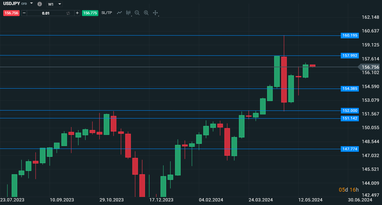 Il cambio UsdJpy ritorna verso i 157, livello molto prossimo ai 158, ultimo livello dove presumibilmente si é visto un intervento della BoJ nella giornata del 1 maggio, subito dopo la conferenza stampa di Jerome Powell. Ricordiamo che in meno di due anni la BoJ ha fatto ben 4 interventi diretti sul mercato valutario a sostegno della valuta domestica, una situazione che comunica al mercato che la BoJ non puó sopportare ulteriori deprezzamenti dello Yen nei confronti del dollaro. A scapito del Giappone abbiamo il carry trade tra dollaro e yen che vede molto favorevole la detenzione di dollari per via del tasso di interesse piú alto rispetto allo yen, la differenza dei tassi piú marcata che troviamo al momento sul mercato valutario. A proposito di yen, questa settimana ci sará l'uscita del dato sul tasso di disoccupazione previsto stabile al 2,6%, un dato che di fatto potrebbe influire poco stavolta sulla politica della BoJ che al momento si trova in una situazione completamente diversa rispetto a quella dell'occidente, ossia una condizione dove si preferisce l'aumento del costo del denaro, o un apprezzamento della valuta al fine di preservare la ripresa da un periodo di deflazione durato qualche decennio. Molto probabile, visti i recenti trascorsi, uno scarico su UsdJpy e un possibile ritorno ribassista verso livelli prossimi ai 152 e oltre.